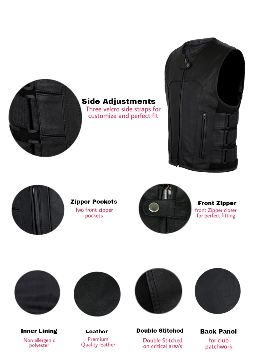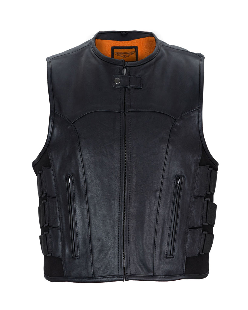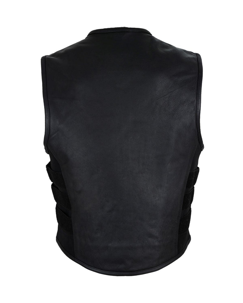 Men's Black Bullet Proof Style Leather Vest with Straps on Side