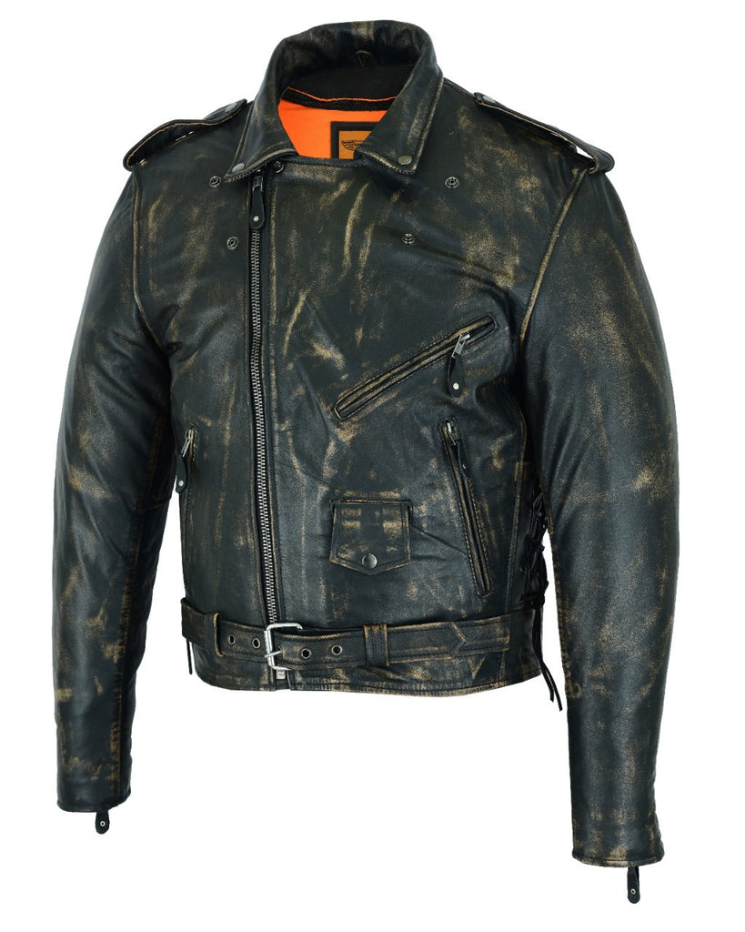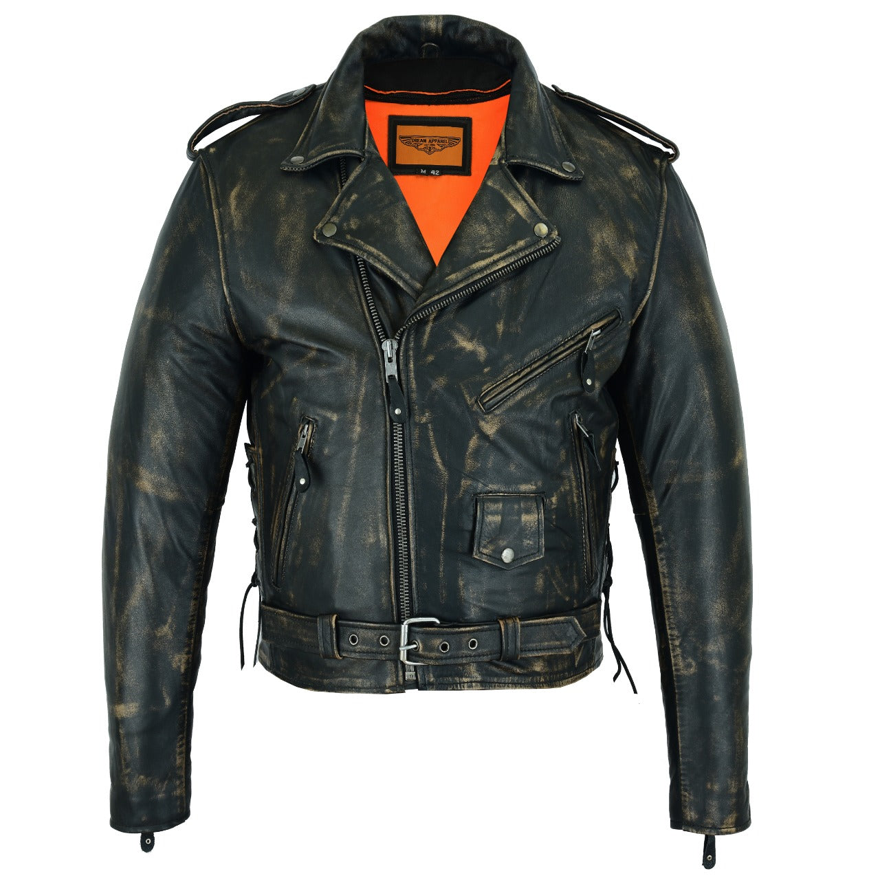 Bring back the good ol' days in our brown genuine, heavy-duty, soft leather jacket with the terrific vintage look. Our fashionable jacket features a full, zip-out lining that runs through the sleeves, epaulets on the shoulders, a fold-down notched lapel collar with button snaps, side laces, and a front zip-up closure. Your comfort's guaranteed with a leather belt, zippered cuffs, two zippered air vents on the back, and one on the front. Bring everything for your trip in two roomy zippered waist pockets, two large concealed gun pockets, and a button-snap stash pocket. You're going to love the fit and feel of this amazing jacket by Dream Apparel.