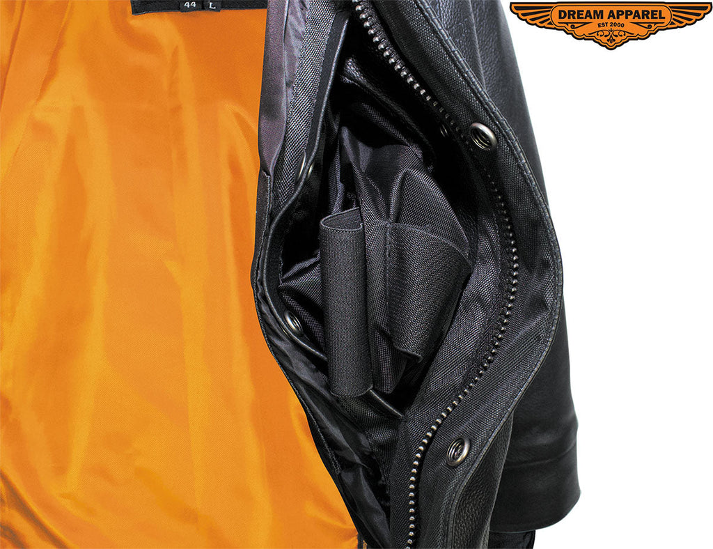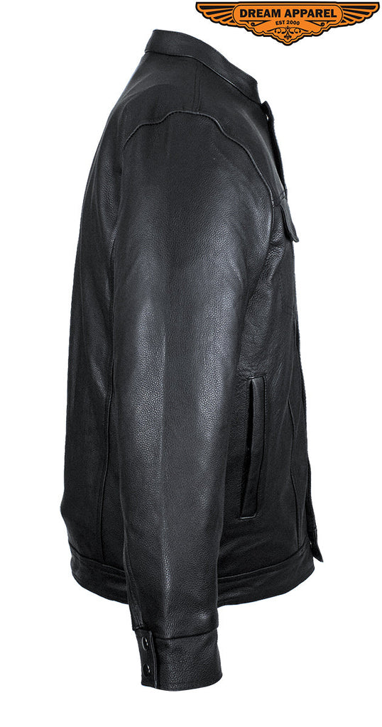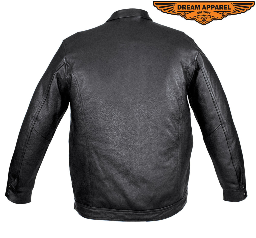 - Zippered and button-snapped front closure Style and comfort were at the forefront when designing this piece. Dream Apparel's all new beautiful black naked cowhide leather motorcycle shirt is hand's down a must have for this time of year. You really can't go wrong. With a vast variety of pockets, seven total, ranging from zippered to snapped you're definitely not going to run out of space. Starting off, you have two small snapped breast pockets. Following those, two large pockets on the waist area, which are also snapped. Heading inside, both sides have a dual snap large pocket. Lastly, a small zippered pocket is placed exclusively on the inner left side. You can't go wrong with all this storage. The shirt has both zippered and snapped front closure, making this a great choice for anyone. Also, the soft touch leather is very high quality and indeed very eye catching. Get on the road with this on, and it'll surely make the ride better. Get yours now!