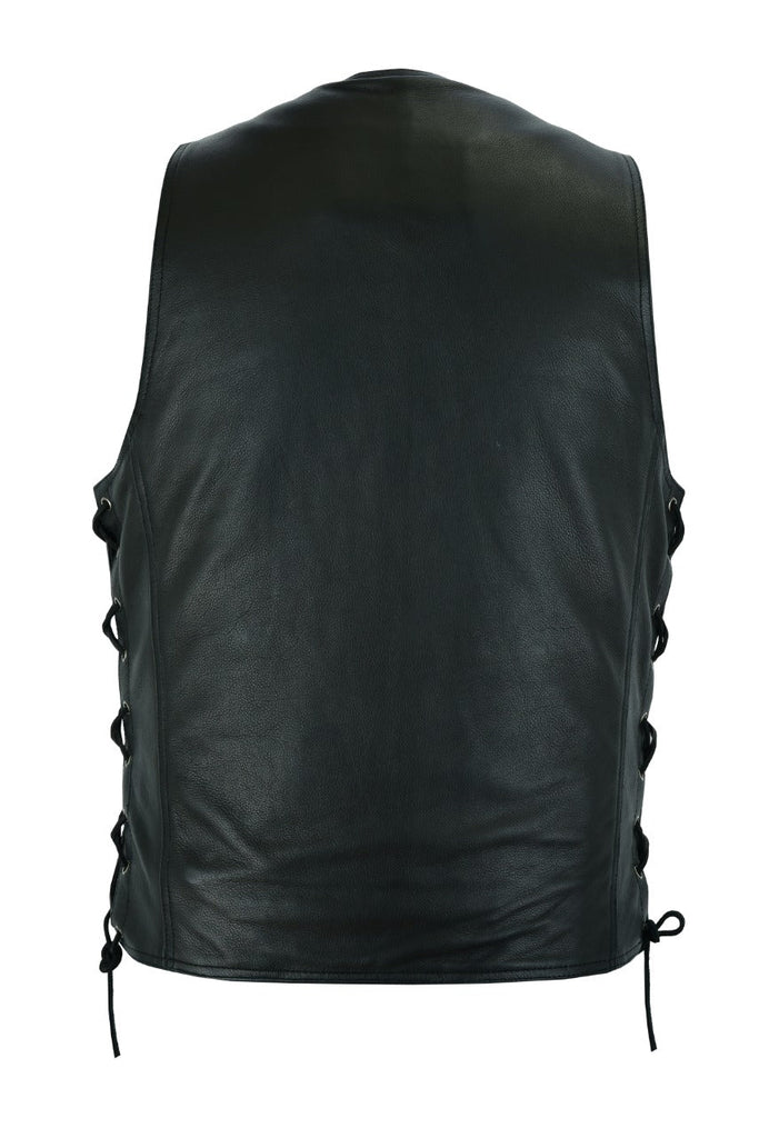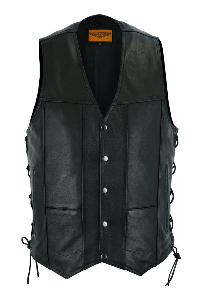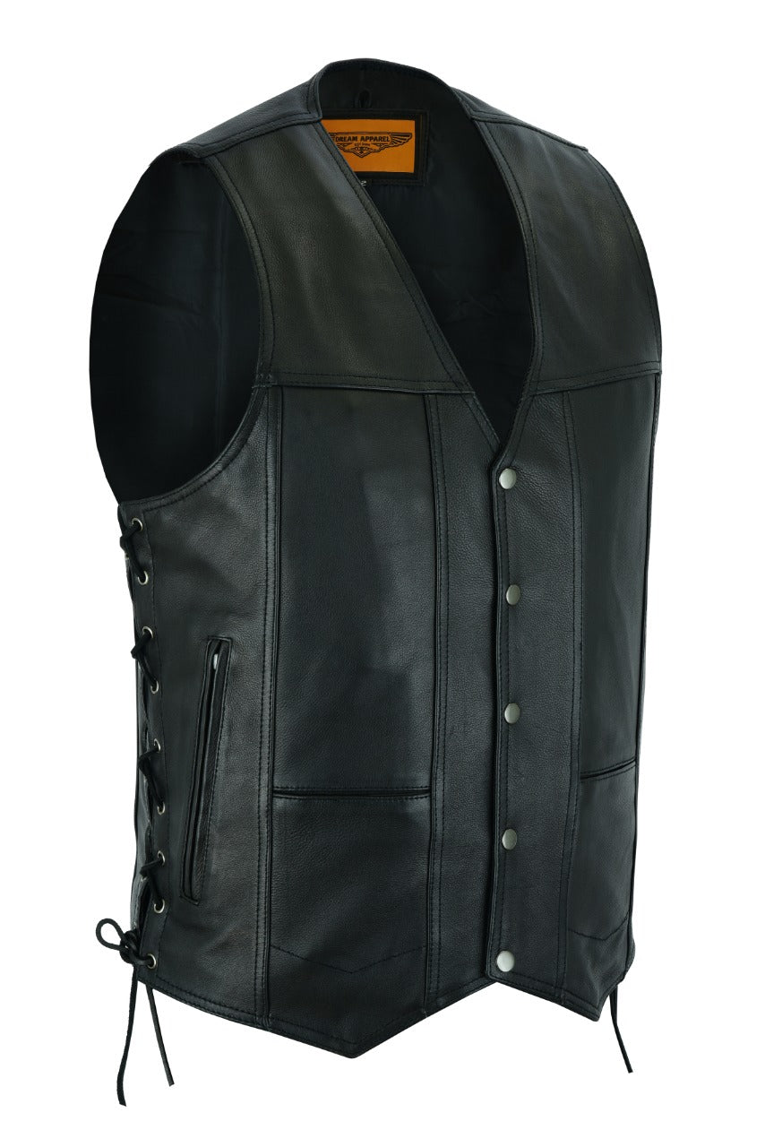 If you like the look and feel of premium leather and like to carry protection on your trips then you're going to want Dream Apparel's plain vest with side laces. This terrific vest features huge concealed gun pockets on both sides. You get an additional two inside pockets with zippered closures and two inside stash pockets. On the front you have another two stash pockets and two roomy waist pockets with zippered closures. You'll