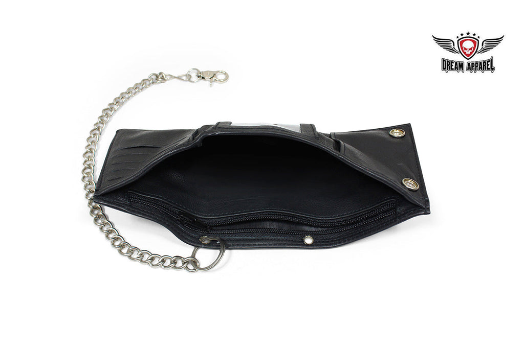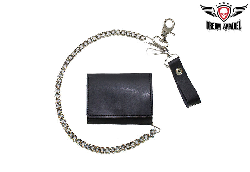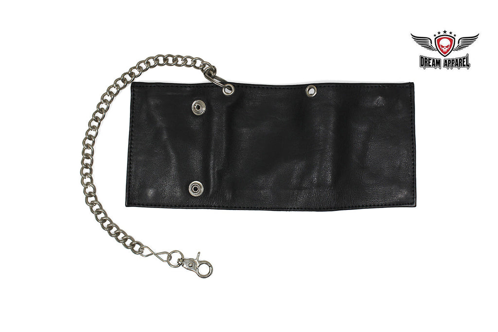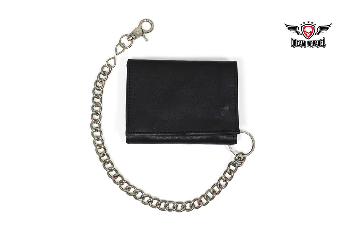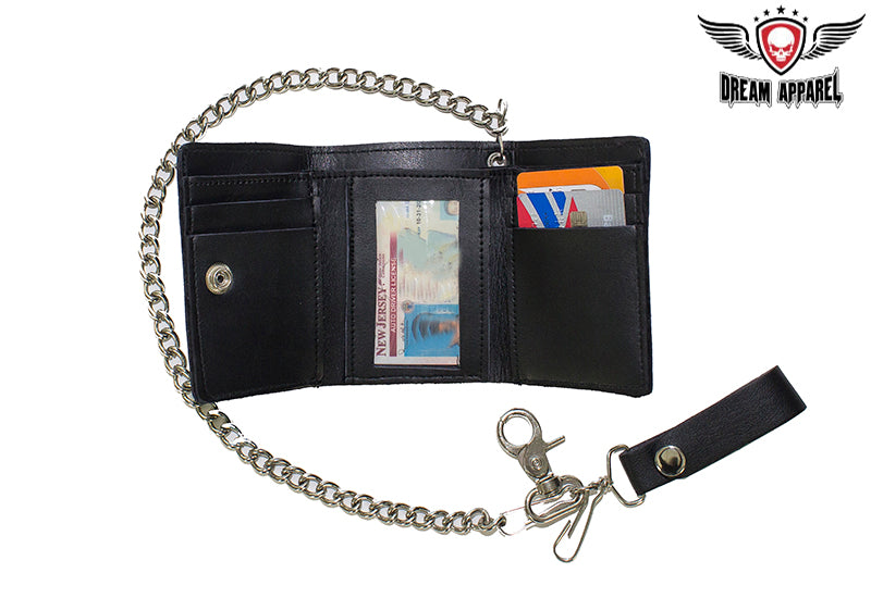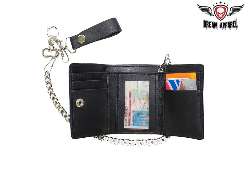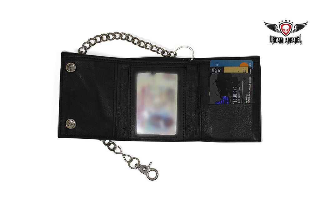 - 4 extra ease-to-access pockets for credit cards, membership cards, ID's, photos and more! This black trifold chain wallet was made with you in mind. Giving you all the compartments needed for your everyday essensials, you can't go wrong! Your money, credit cards, and photos can now all be stored in this stylist, yet secure place. Made with 100% real leather, not only are they durable and long lasting but they are also quite the fashion statement at the most afforable price.