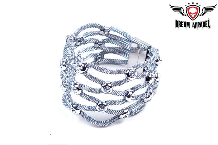 Womens Stainless Steel Mesh Bracelet With Stones & Magnetic Closure